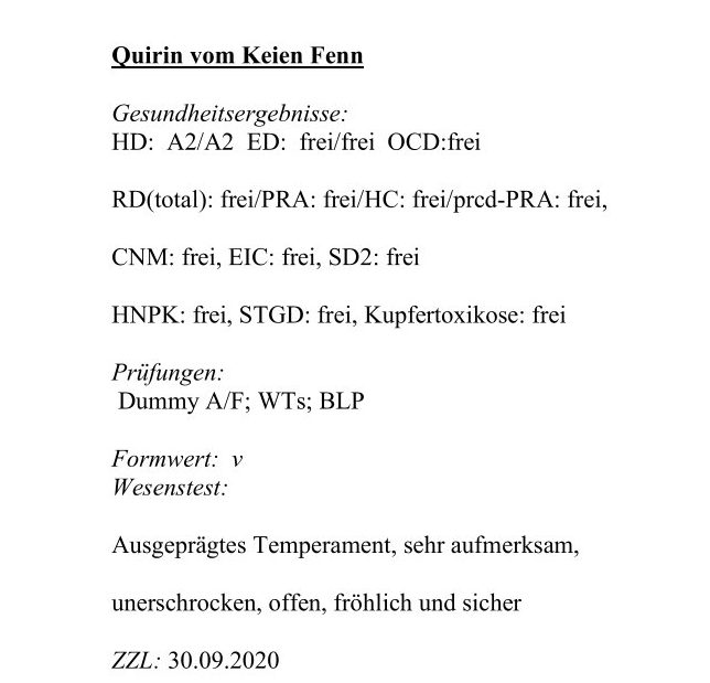 Deckrüde von Smilla wird - wenn alles klappt -Quirin vom Keien Fenn (Sky) werden. Smilla wird voraussichtlich Mitte/Ende April 2026 wieder läufig. Sky ist ein freundlicher, sehr angenehmer Rüde mit ausgeglichenem Wesen. Es sind bereits mehrere Würfe aus ihm hervorgegangen. Seine Nachzuchtergebnisse sind sehr gut, sowohl was Wesen als auch Passion der Hunde betrifft. Besonders hervorzuheben sind seine ausgezeichneten Gesundheitsergebnisse.